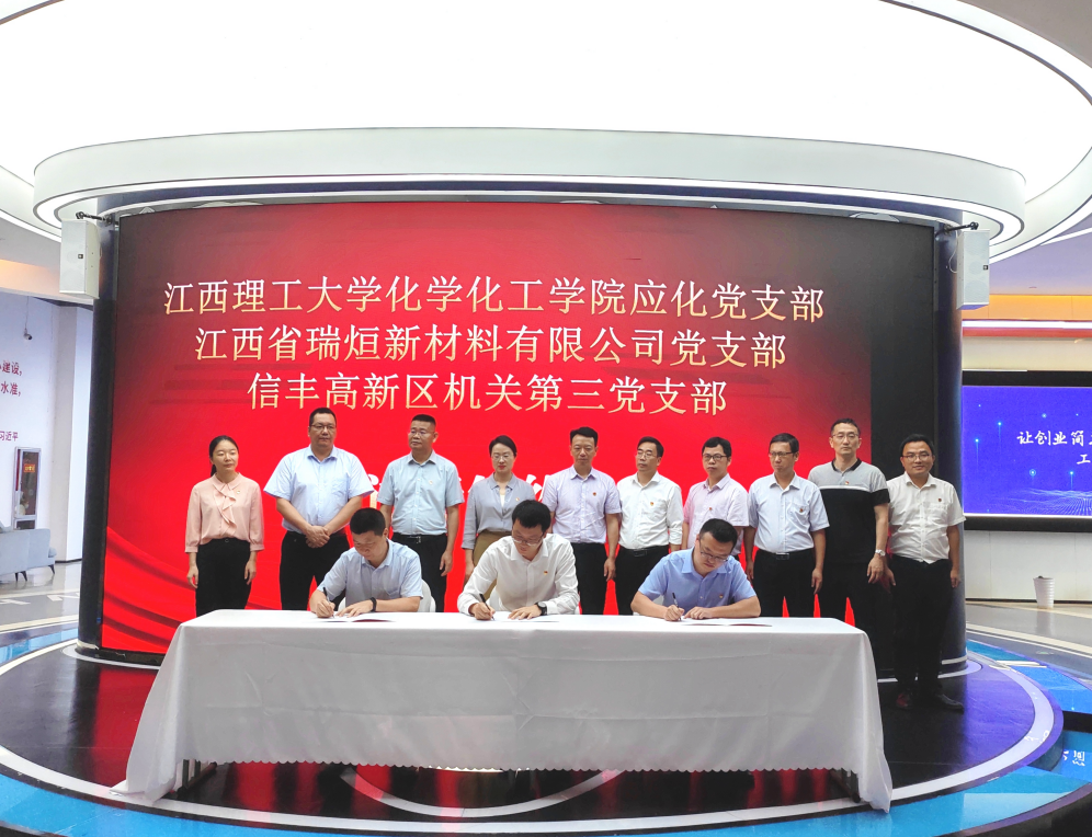瑞烜新材料、福昌发电子党支部书记及相关负责同志介绍了企业发展、支部建设、文化氛围、人才需求以及工艺技术特点等情况。签约仪式上,信丰高新区机关第一、三党支部,福昌发电子党支部、瑞烜新材料党支部分别与学院应化、化工党支部结对共建。活动期间,学院党委一行还深入江西省瑞烜新材料有限公司和信丰福昌发电子有限公司进行实地调研,了解人才和生产技术需求。