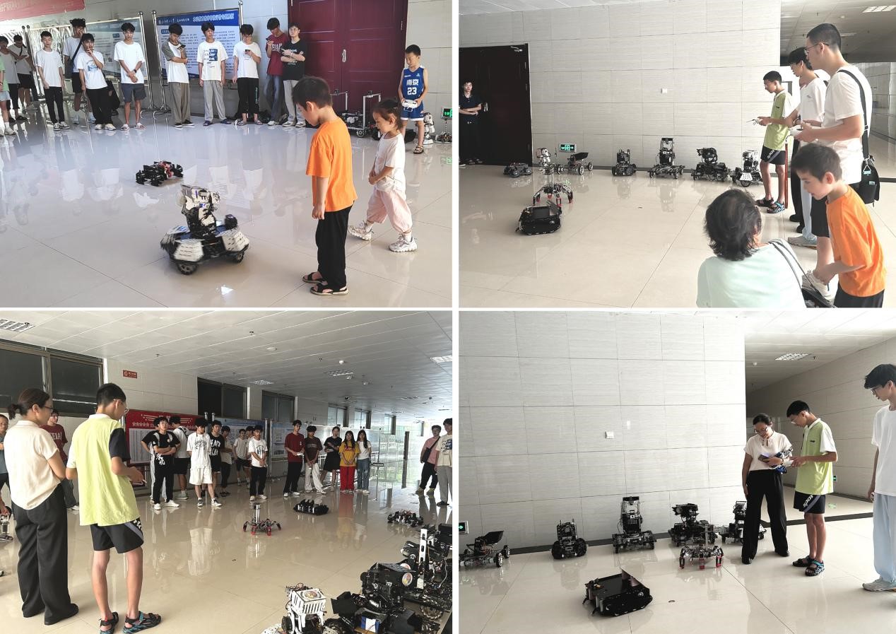 7月10日上午,在熊飞龙老师的带领下,同学们于南昌校区图书馆一楼大厅进行夏令营活动实践展示,其中包括人形机器人、仿生机器人、自动水果采摘机器人、履带式机器人、异形足机器人、平衡独轮车以及全自动智能竞赛小车等。学校老师们纷纷带家属前来参观,亲自体验机器人操控。生动有趣的机器人引发小朋友们的兴趣和好奇,不断向参展学生提出问题。