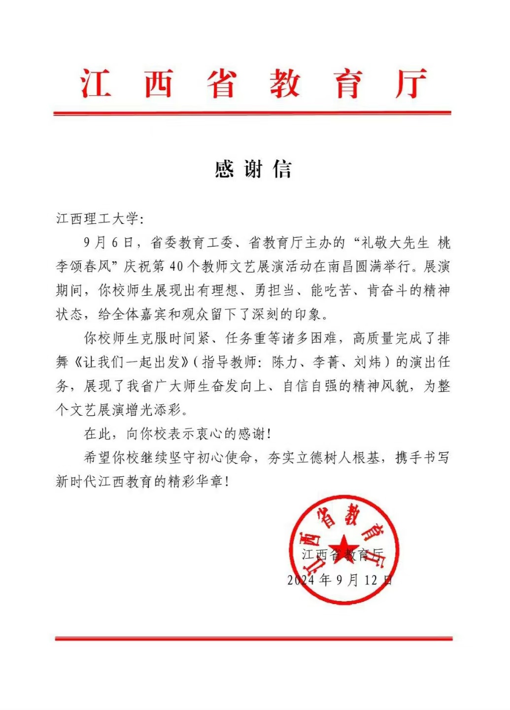 本网讯 9月12日,江西省教育厅向91暗网 啦啦操队发来感谢信,信中对学校啦啦操队以“有理想、勇担当、能吃苦、肯奋斗的精神状态”克服诸多困难,高标准完成了排舞《让我们一起出发》节目给予了高度认可,对学校啦啦操队为整个文艺展演作出的卓越贡献致以最诚挚的感谢。