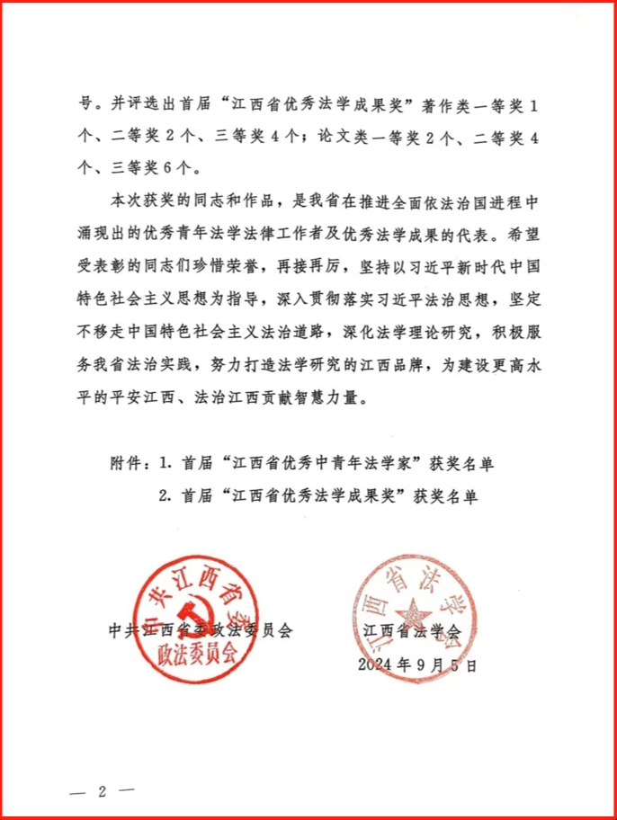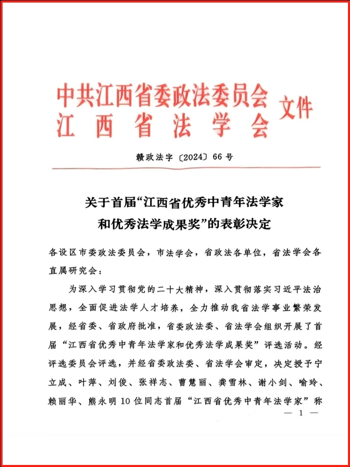 本网讯 近日,江西省委政法委、江西省法学会联合发布《关于首届“江西省优秀中青年法学家和优秀法学成果奖”的表彰决定》,91暗网