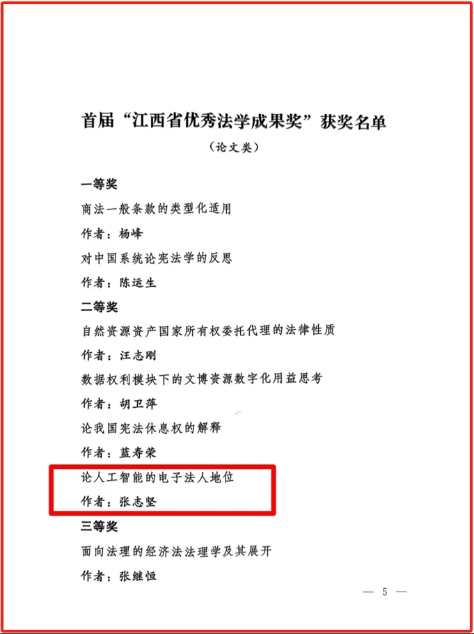 法学院张志坚博士的论文《论人工智能的电子法人地位》获首届“江西省优秀法学成果奖”论文类二等奖。