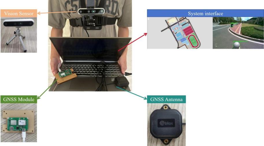 三江校区为研究区,并综合应用系列开源软件:GIS客户端软件OpenLayers、GIS服务器软件GeoServer、PostgreSQL数据库,以及相关硬件:realsenseD455视觉传感器、ublox ZED-F9P GNSS定位模块和深度学习模型Yolov8开发了一个盲人导航原型系统。从预期实验效果来看,该项研究成果具有重要的推广价值,并将产生重要的社会影响力。