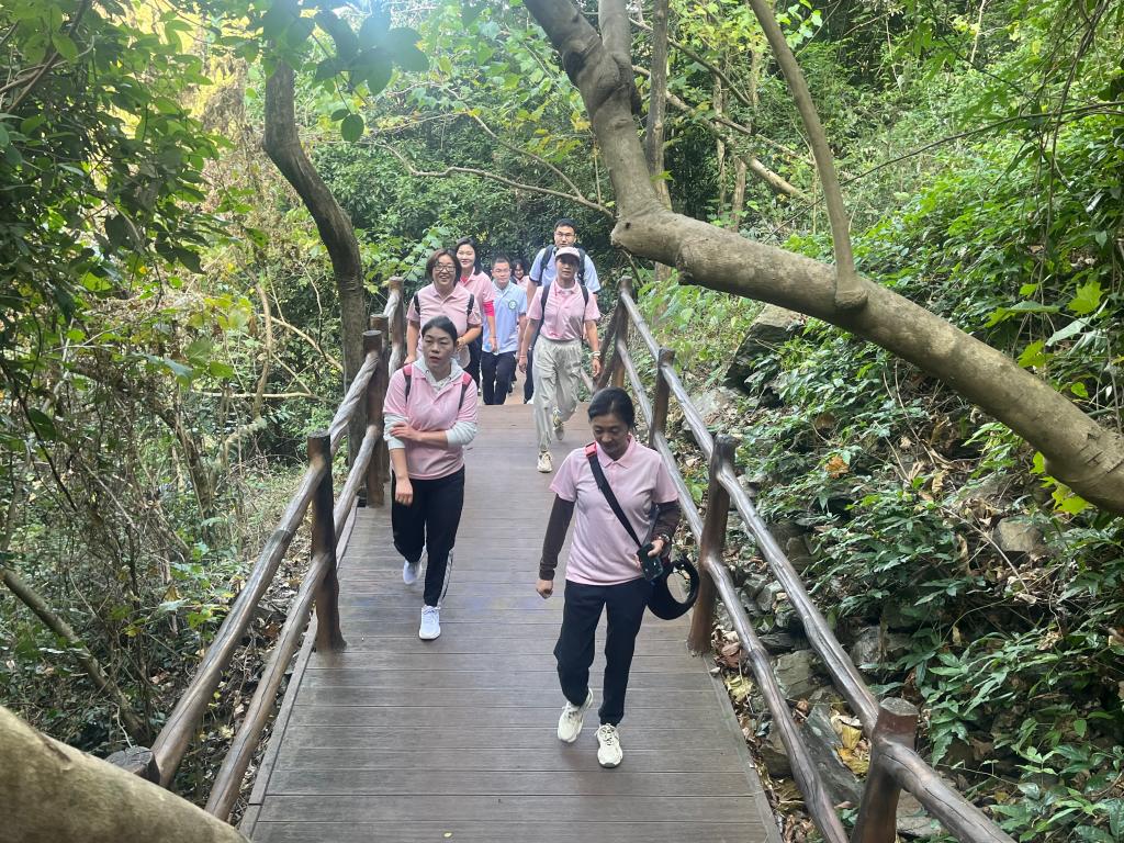 赣南游击词主题园位于信丰县油山镇坑口村,是当年赣粤边三年游击战争指挥中心。如今这片充满红色记忆的土地上建起了一座以红色为魂、乡村为辅、山水为景的生态文化旅游基地,同时也是广大党员、干部、群众和青少年接受革命传统教育的爱国主义教育基地。教职工们重走这条游击秘道,参观陈毅露营处,瞻仰红军指挥中心,还有藏在大石背后、树丛旁边的红军战士雕像,仿佛身临其境地感受游击战争的场景,追忆这段峥嵘岁月。
