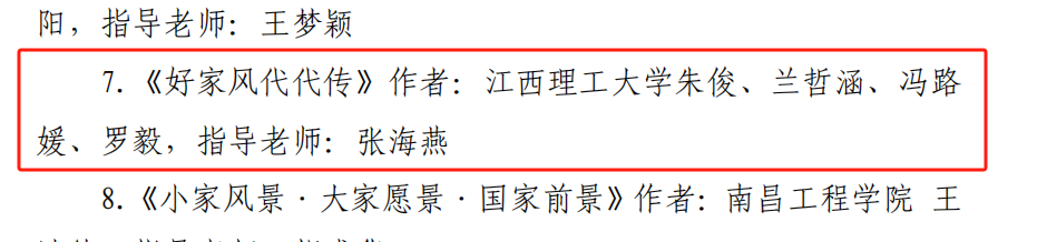 学生朱俊、兰哲涵、冯路媛、罗毅作品《好家风代代传》(指导老师:张海燕)荣获家风故事作品三等奖,建筑与设计学院学生孙宇涵作品《清廉家风古今存》(指导老师:郭文瞻)荣获书法作品三等奖。