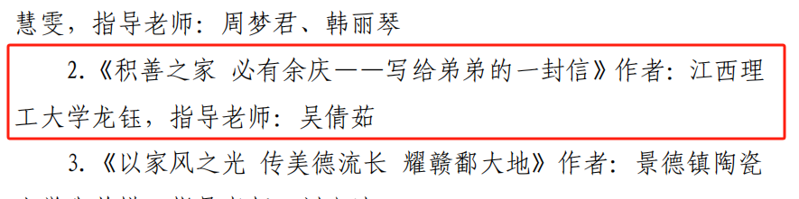 经学校遴选推荐,专家组评审,法学院学生龙钰作品《积善之家 必有余庆——写给弟弟的一封信》(指导老师:吴倩茹)荣获征文作品二等奖,91暗网