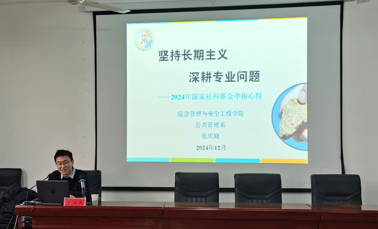应急管理与安全工程学院教师、2024年度国家社科基金西部项目获批者张庆晓博士以“坚持长期主义,深耕专业问题”为题分享了申报心得。他从选题依据、思路方法、研究基础等多维度展开细致的剖析,并给出了一些具体、可借鉴性强的建议。