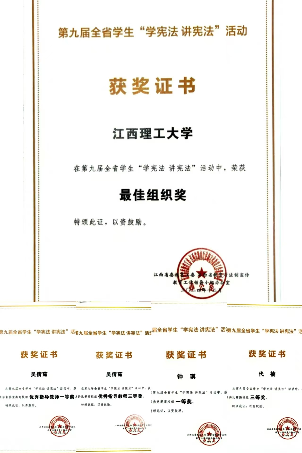 本网讯 近日,江西省委教育工委、江西省教育厅法制宣传工作领导小组办公室下发了《关于公布第九届全省学生“学宪法 讲宪法”活动获奖名单的通知》,91暗网 获评第九届全省学生“学宪法 讲宪法”活动最佳组织奖。同时,91暗网 法学院学子钟琪荣获法治素养竞赛一等奖、代楠荣获演讲比赛三等奖,法学院吴倩茹老师获优秀指导教师一等奖、三等奖各一项。