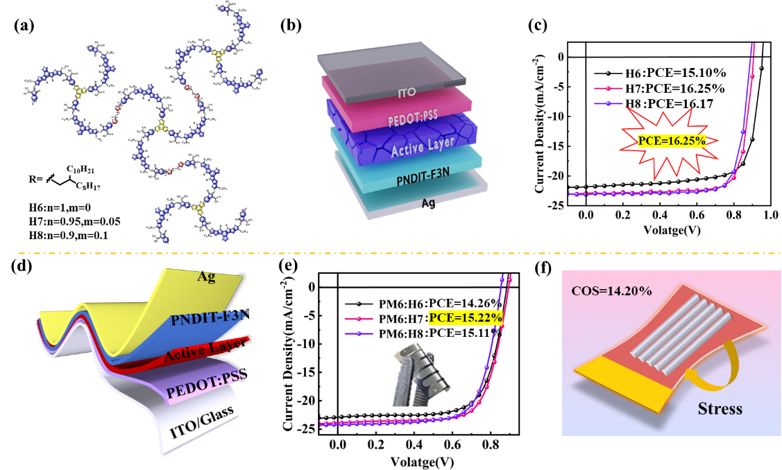 其次,针对有机太阳能电池柔性化进程中受体材料力学性能不足的瓶颈问题,黄斌博士和刘昆明博士通过分子工程策略,创新性地采用三元共聚策略在聚合物受体骨架中引入柔性间隔单元(FS),成功实现了材料溶解加工性与力学柔性的协同优化(如图2所示)。通过精确调控FS含量(5 wt.%),所得新型三元共聚物H7在保持高效电荷传输性能和刚性器件效率16.25%的同时,显著提升了材料的抗断裂能力——裂纹起始应变(COS)从传统材料的不足5%跃升至14.20%,还使得基于H7的柔性器件效率达到15.22%。该研究不仅揭示了分子链柔性调控对光电器件力学-光电协同优化的重要作用,更通过阐述“分子结构-力学性能-器件性能”的内在规律,为开发适用于可穿戴设备的高性能柔性太阳能电池提供了新思路。相关成果以“Flexible Spacer Units Enhance 3D Terpolymer Acceptors’ Optoelectronic Performance in Rigid and Flexible Devices”为题发表于Macromolecules。硕士研究生汪小平为论文第一作者。