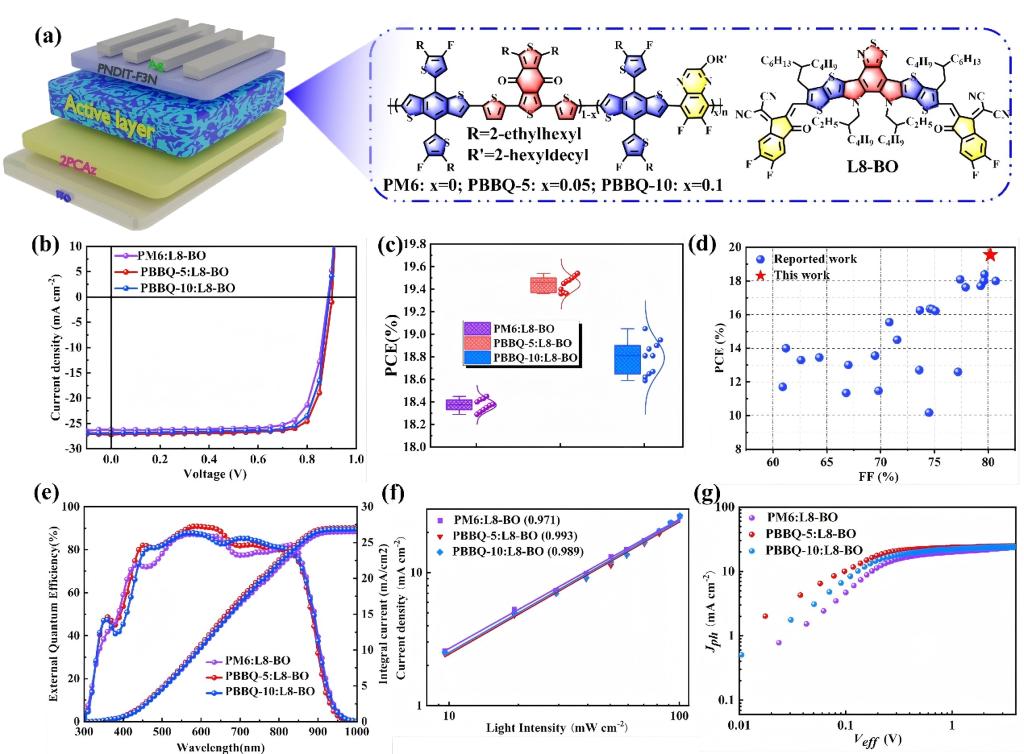 最后,针对三元共聚策略中第三组分破坏聚合物序列周期性的关键瓶颈问题,黄斌博士与李立清教授创新性提出“分子精准手术”设计理念。研究团队以明星给体PM6为分子母体,通过引入含二氟取代喹诺啉(ff-Qx)的第三功能单元,构建了兼具非共价键锁合与静电势梯度的双轴调控机制(如图3所示)。实验证实,ff-Qx单元通过N···S非共价相互作用显著提升了聚合物的共轭面,同时通过静电势差构建分子间电子传输通道,有效提高混合膜的电荷传输性能。这种"分子内锁固-分子间协同"的双重作用,使三元给体PBBQ-5在保持序列规整度的前提下,实现19.54%的器件效率。研究证明,尽管利用三元的方法引入第三组分会导致聚合物骨架的不规则分布,但是通过在分子内构建非共价键和改善聚合物给体的ESP,可以有效增强分子内/分子间相互作用,为开发高性能聚合物供体提供了一条新途径。研究成果以“Fine-Tuning Intra/Inter-Molecular Interaction via Ternary Copolymerization Strategy to Obtain Efficient Polymer Donors”为题发表于Small。