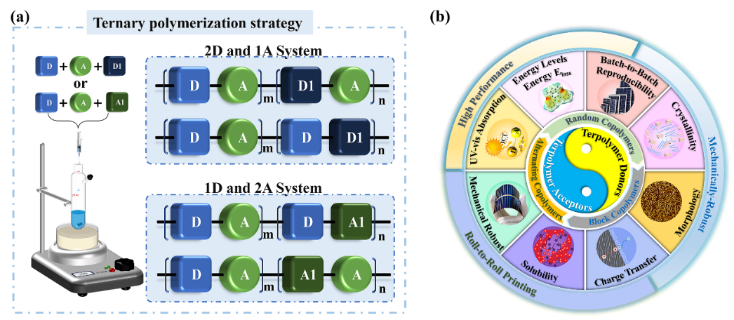 首先,针对有机太阳能电池产业化进程中性能稳定性与可加工性协同优化的关键科学问题,黄斌博士和刘晋彪教授联合重庆大学陈珊珊副教授和高丽大学Han Young Woo教授等人系统介绍和总结了三元共聚策略在高性能聚合物光电材料领域的最新进展,并提出了基于三元共聚策略在未来有机太阳能电池中存在的挑战和应用前景(如图1所示)。综述以“High-Performance Photoactive Polymers: Innovations in Ternary Polymerization for Solar Applications”为题发表于Advanced Energy Materials,第一作者为直博生方雨。