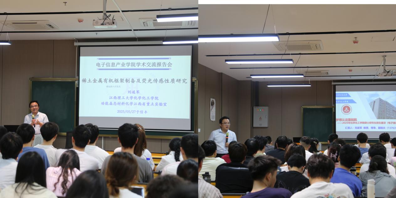 在电子信息产业学院,刘遂军还面向应用化学专业学生开展专业前沿讲座,介绍团队开展的稀土金属有机框架制备及荧光传感性质研究,并介绍了学院研究生招生政策和备考建议。