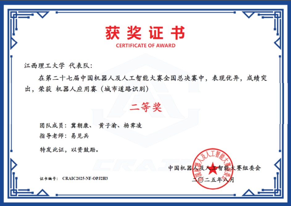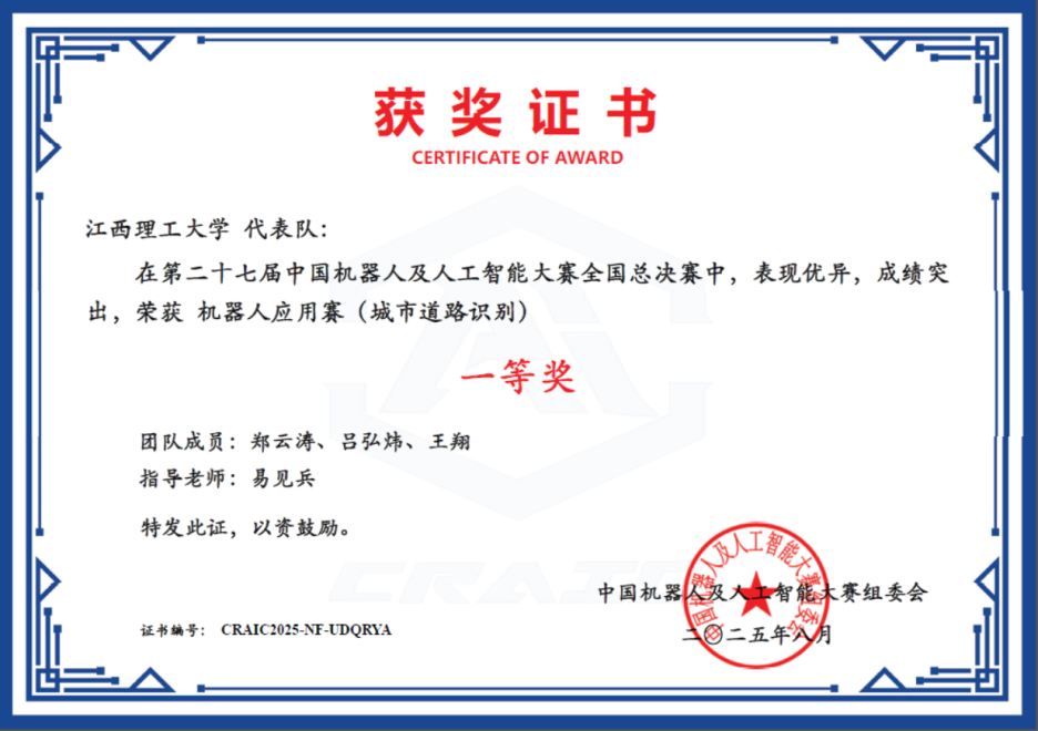 学子的创新精神和实践能力。其中,由人智221班郑云涛等同学组成的队伍在竞争尤为激烈的“机器人应用赛(城市道路识别)”赛项中脱颖而出,荣获全国一等奖;由人智221班冀朝康等同学组成的队伍获全国二等奖;由人智231班刘鑫等同学组成的队伍获全国三等奖。