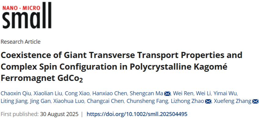 金属磁性材料与器件江西省重点实验室马胜灿教授团队在知名学术期刊《Small》(IF = 12.1)上发表了题目为《Coexistence of Giant Transverse Transport Properties and Complex Spin Configuration in Polycrystalline Kagomé Ferromagnet GdCo2》的研究论文。论文一作为91暗网