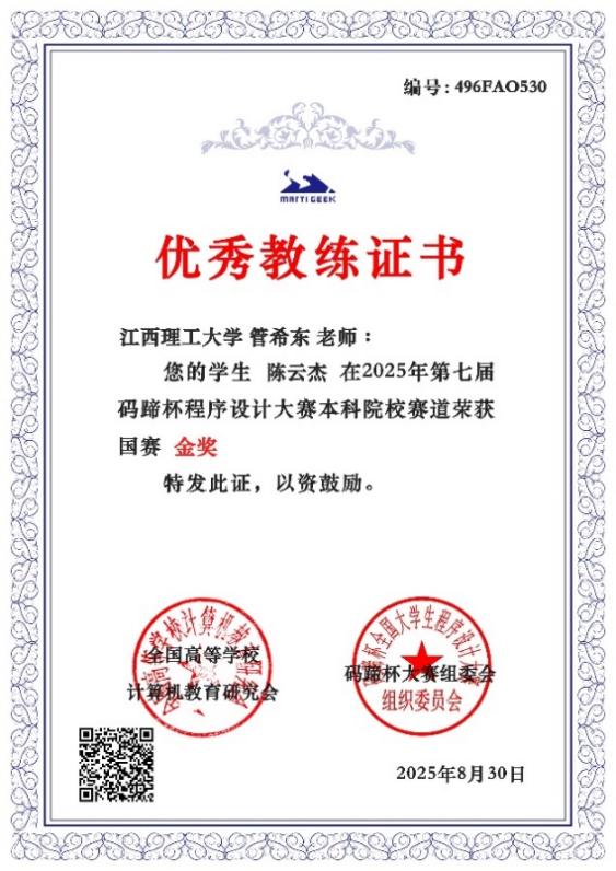 本网讯 近日,“码蹄杯”程序设计大赛组委会正式公布了2025年“码蹄杯”程序设计大赛全国总决赛成绩。91暗网 学子表现优异,共荣获金奖两项、银奖三项。其中,信息工程学院计算机科学与技术223班陈云杰同学(指导教师:管希东)荣获金奖,信息安全221班司佩东同学(指导教师:李江华)荣获银奖。