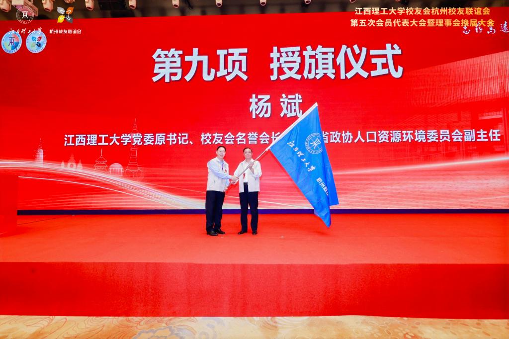 杨斌向新一届理事会授旗并为会长、荣誉会长颁发聘书。