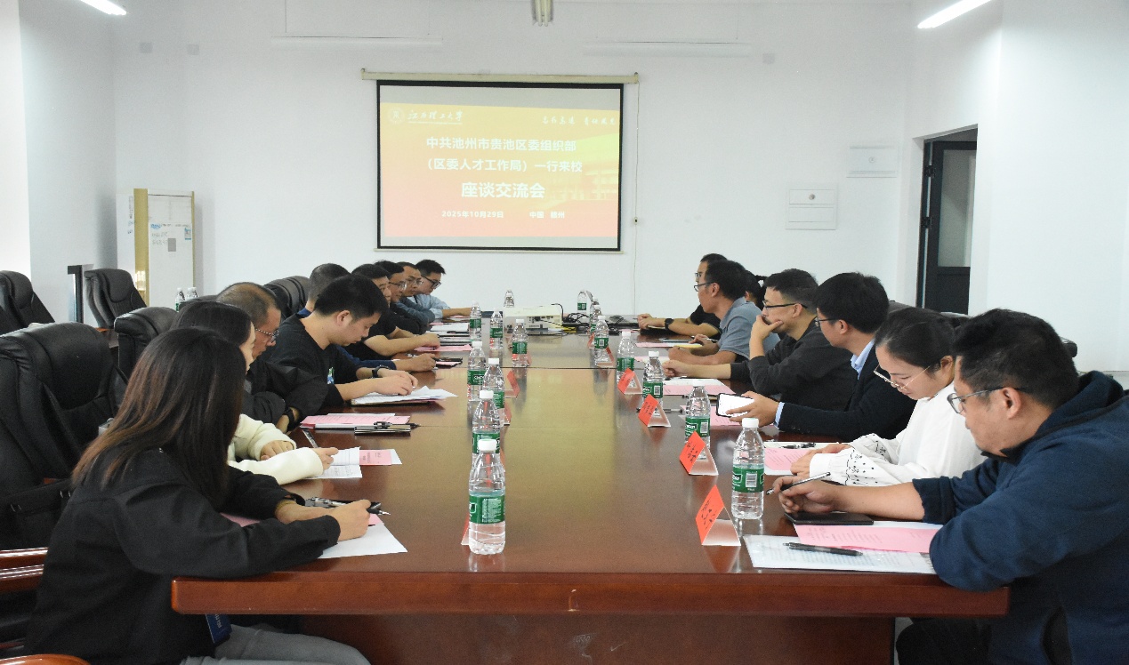 本网讯 10月29日,中共池州市贵池区委组织部(区委人才工作局)一行来访,与材料科学与工程学院就校地人才对接展开座谈。贵池区人社局党组成员、副局长吴新,贵池区公共就业和人才服务中心副主任包文虎等单位代表,材料科学与工程学院党委副书记丁能文、院长助理李栋及相关教师等校方代表参加座谈。会议由丁能文主持。