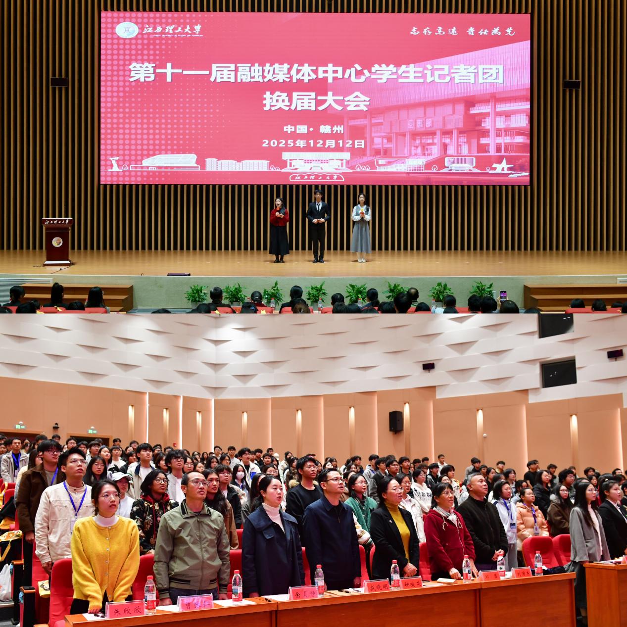 第十一届融媒体中心学生记者团换届大会在三江校区东园志远会议中心举行。校党委常委、宣传部部长盛晓明,宣传部副部长余夏静、钟峻燕出席大会。融媒体中心指导教师、各二级学院联络员代表及融媒体中心第十一届全体成员参加大会。