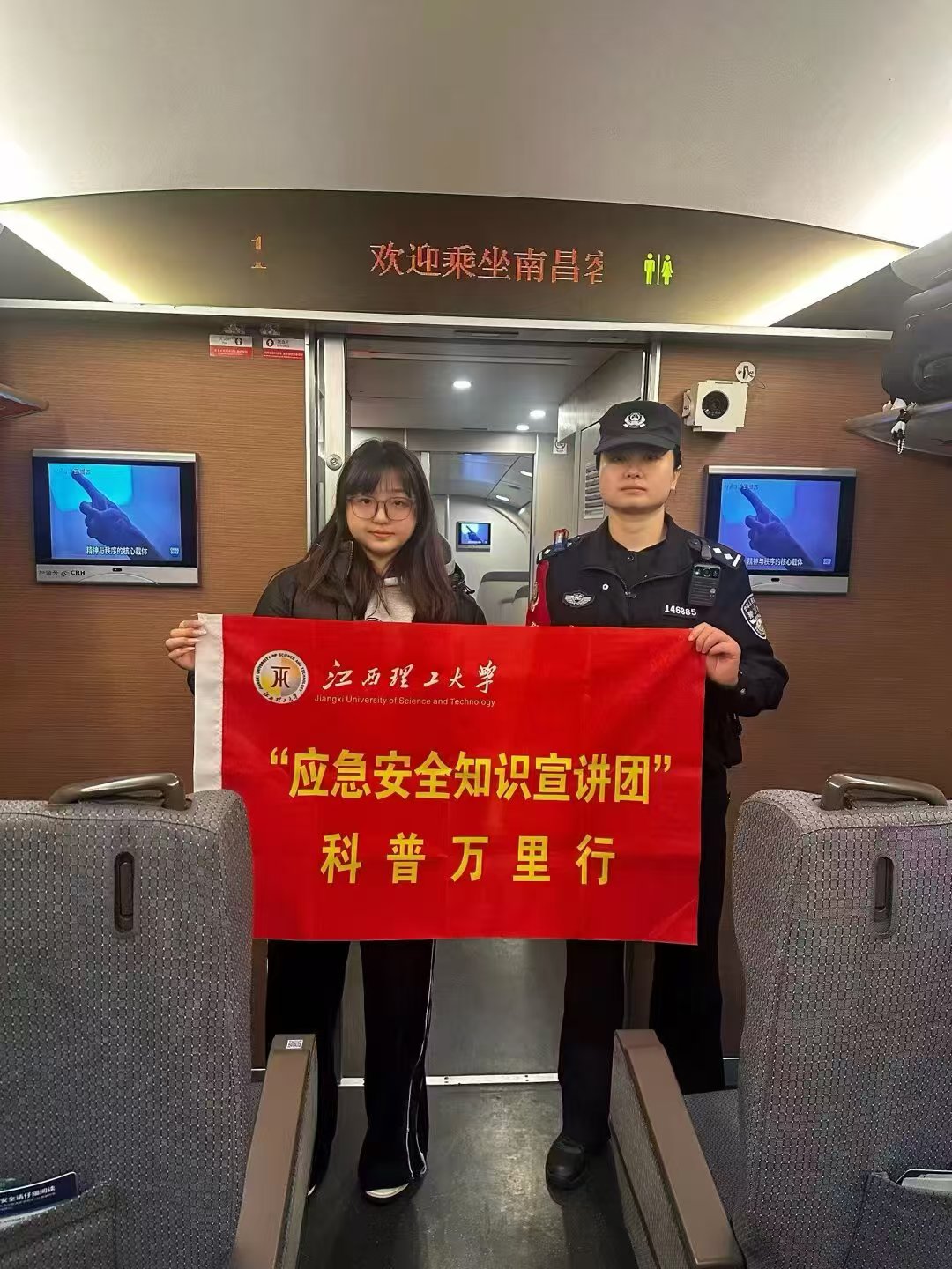 本网讯 寒假如约而至,“返家乡” 的列车鸣笛启程。为切实普及安全知识,助力守护出行平安,学校安全工程学院联合赣州铁路公安处乘警支队,在G1354/G1355等13次列车开展“平安列车,青春护航”主题列车宣讲活动。学子们化身“流动安全员”,以专业行动筑牢旅途安全防线,让归乡之路满含平安与暖意。